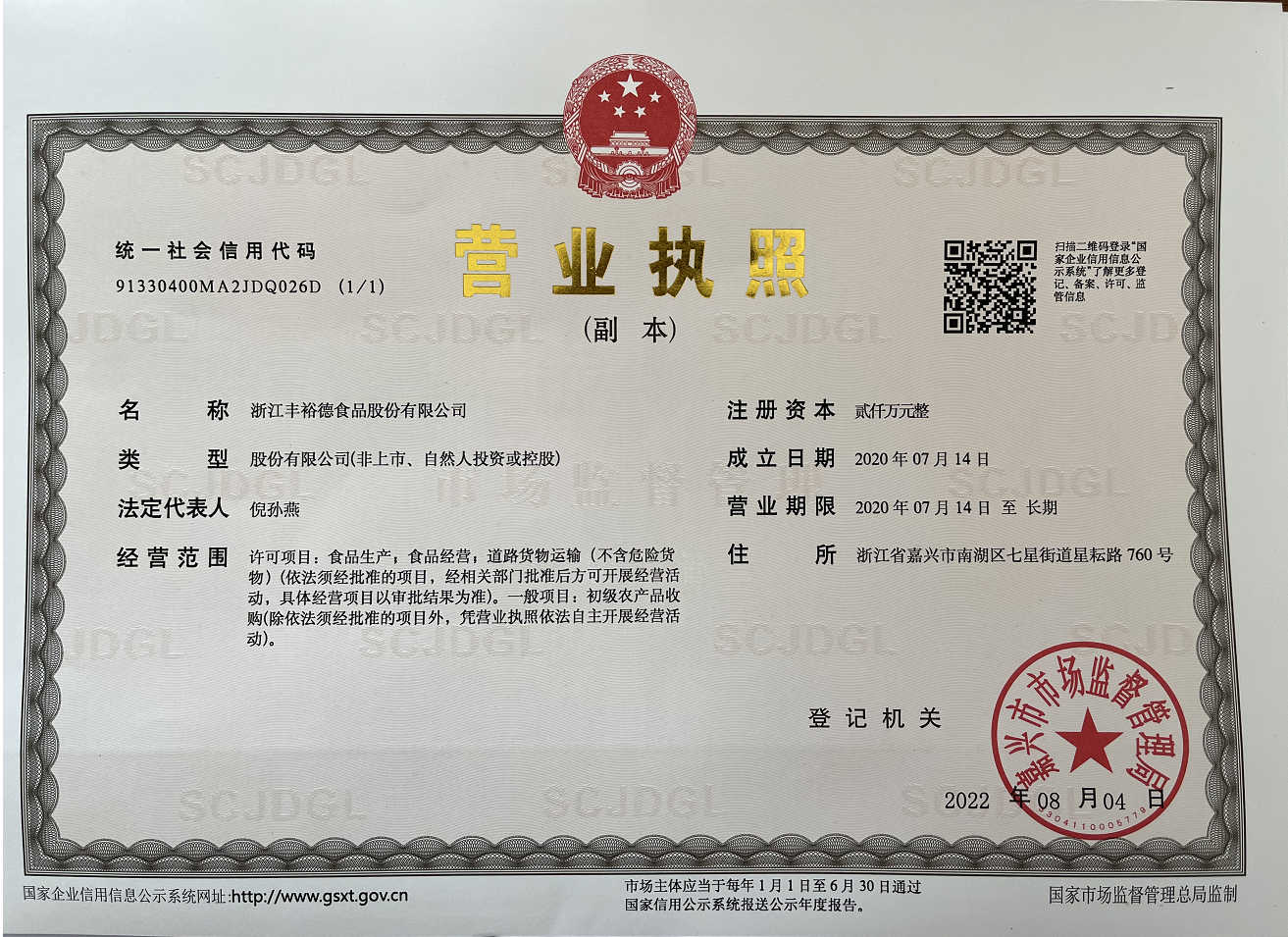 浙江豐裕德食品股份有限公司成立于2020年7月,注冊資金2000萬元,公司位于嘉興市南湖齋食品股份有限公司旁新增土地12畝,新建標準廠房11500平方米,總投資為4500萬元。配套設備淘米及拌米料線、拌米機、切肉機、保鮮冷庫、冷凍庫、粽子蒸煮鍋、高溫殺菌鍋等。項目達成后可實現(xiàn)年產(chǎn)量粽子2700噸、并有擁有出口資質(zhì),及食品安全管理體系ISO22000。